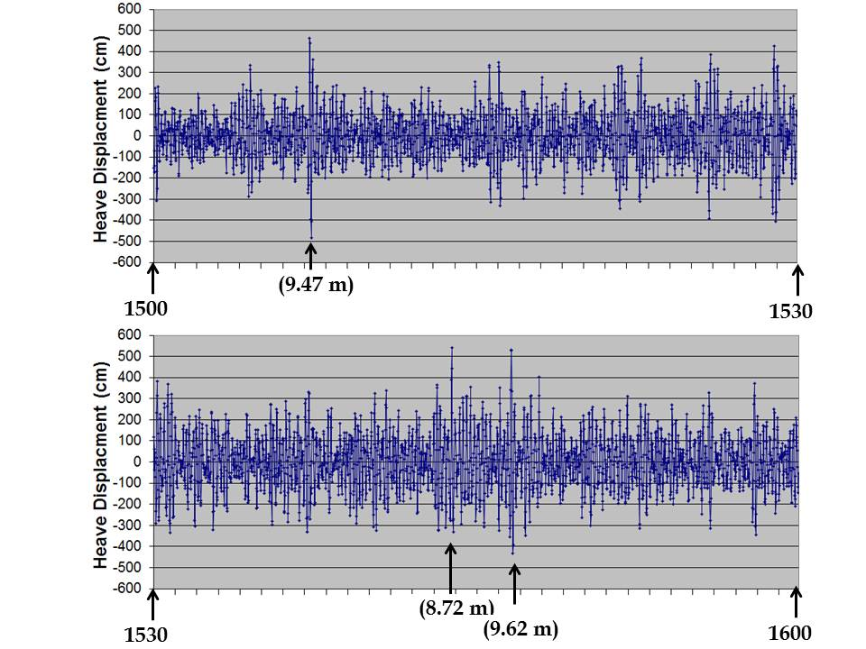 As the waves were coming from the south, the waverider buoy recorded the wave heights after they had been experienced at the rig. The travel time of a wave with an 8-second period from the rig to the waverider buoy is approximately 14 minutes.Footnote 26 If the waves maintained their characteristics throughout, then the measurement of the waves at the buoy would be indicative of the waves experienced at the rig 14 minutes earlier. The wave heights of 8.72 m and 9.62 m were measured at the waverider buoy 14 and 16 minutes after the striking occurred. It is therefore possible that one or more similar waves were experienced by the vessel immediately before it struck the rig.