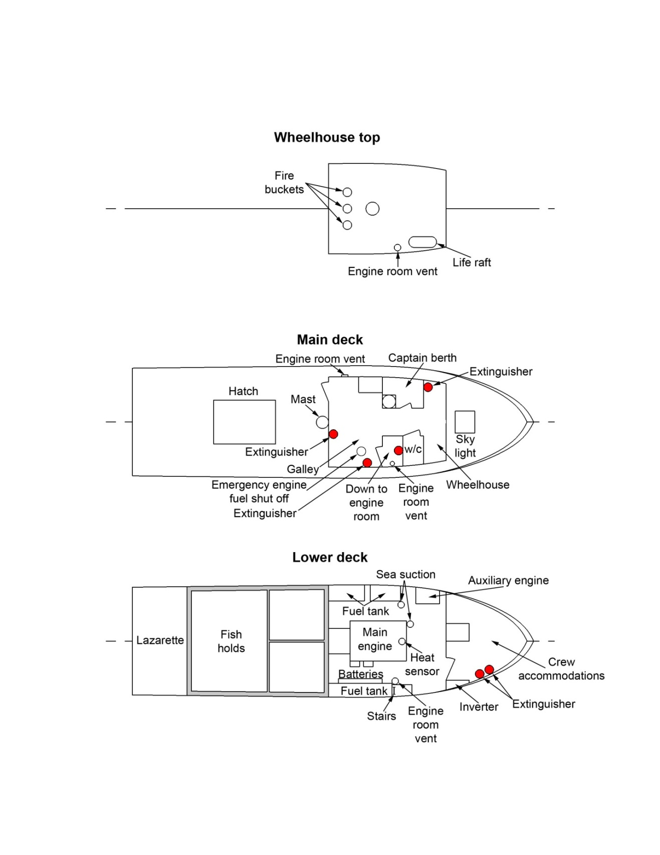 WorkSafeBCFootnote 7requires that every fishing vessel carry documentation, readily accessible to crew members, about the vessel, including its firefighting and emergency equipment. In addition, the master must ensure that each crew member is instructed on the operational characteristics of the vessel including the location and use of safety equipment. The master must also establish procedures and assign responsibilities to each crew member to cover all emergencies including fire, man overboard, flooding, abandoning ship, and calling for help.Footnote 8