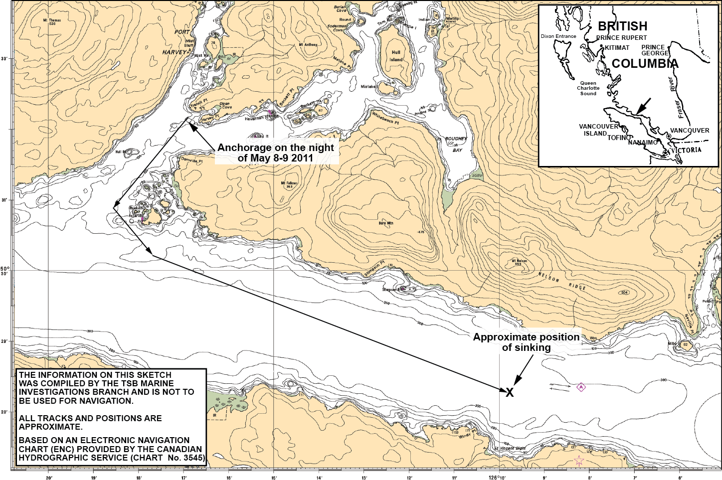 At 0758, the CCGS Point Race arrived on scene. By this time, the vessel was fully engulfed. The vessel eventually sank at 0938 in position 50°28′12″ N, 126°09′36″ W (Photo 3). (Appendix B)
