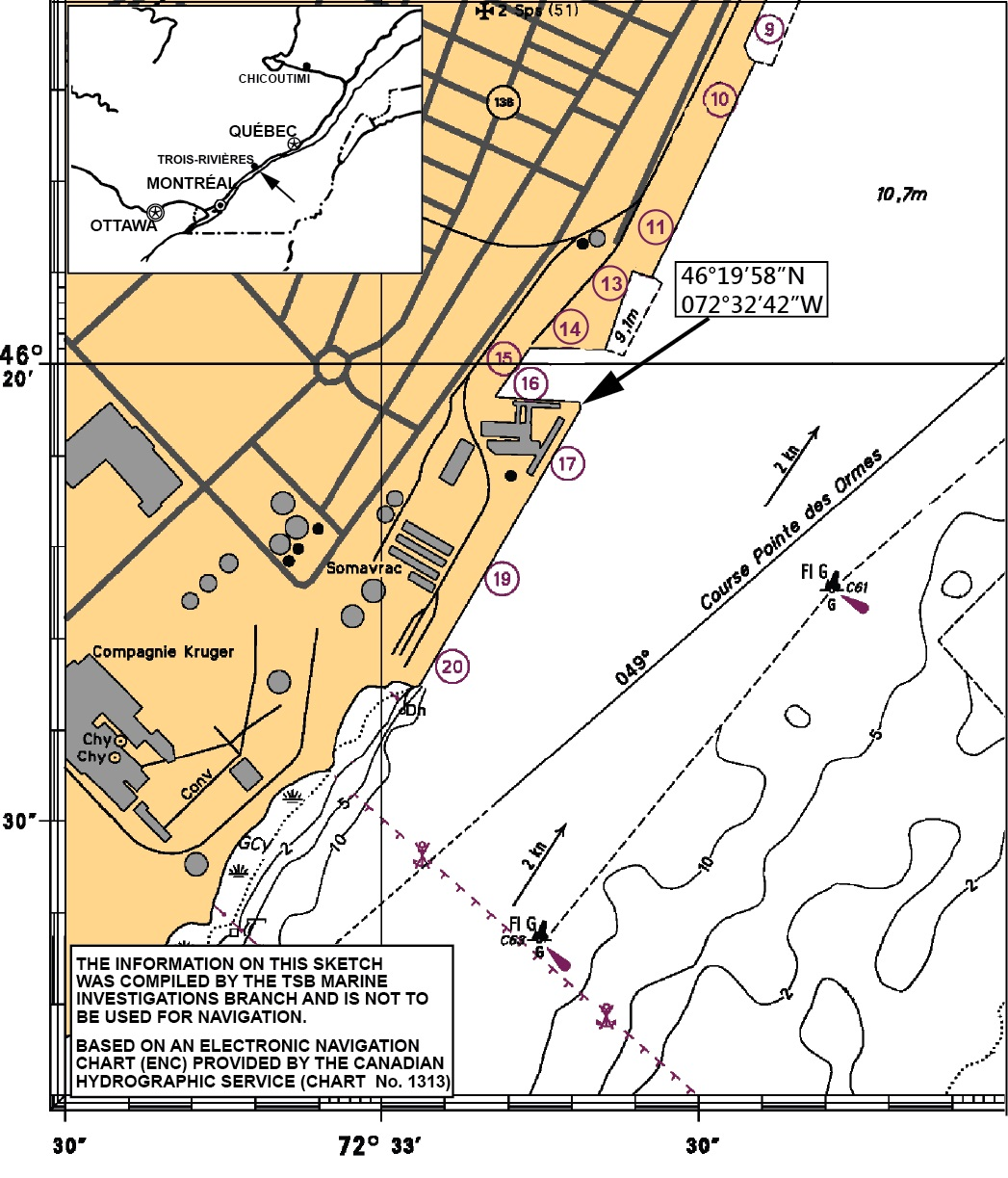On the day of the occurrence, the weather was clear and winds were from the east-northeast at 5 to 7 knots. Low tide was at 1742, and the water level was predicted to be 1.1 m above chart datum at low tide. The tidal influence at Trois-Rivières is minimal; the maximum rise and fall of the tide is about 0.3 m. However, during the year, the monthly mean water level varies between 0.7 and 3 m above chart datum. The average rate of the current in the harbour is 1.5 knots.