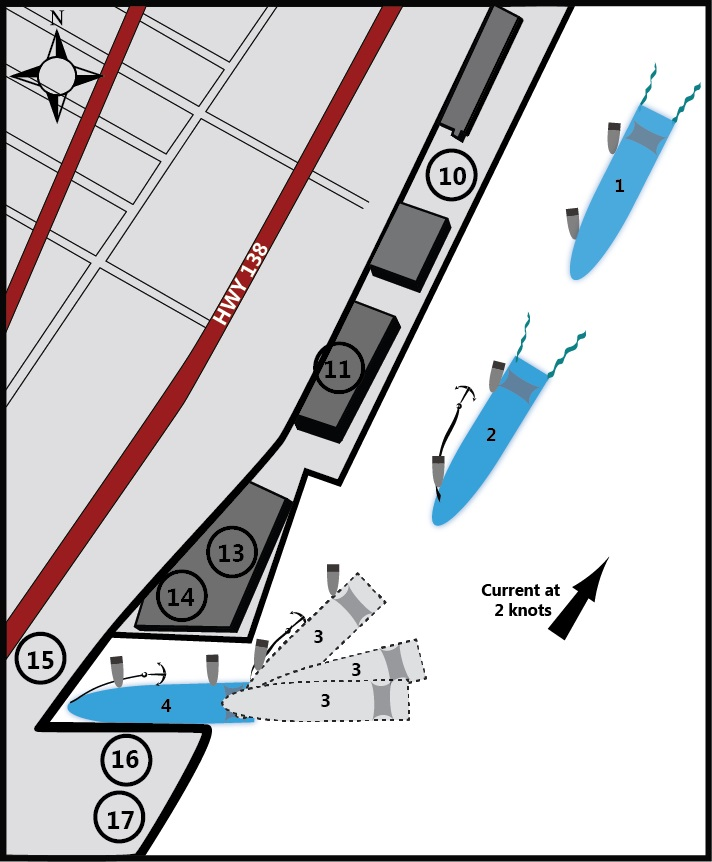 Helm and propulsion are to be used initially to bring the vessel from the lower part of the river (section 10) to the entrance of the basin at a distance of approximately 3 vessel widths off the docks. Tugs, which may be used at the pilot’s discretion, are to be positioned on the starboard side of the vessel, one forward and one aft.