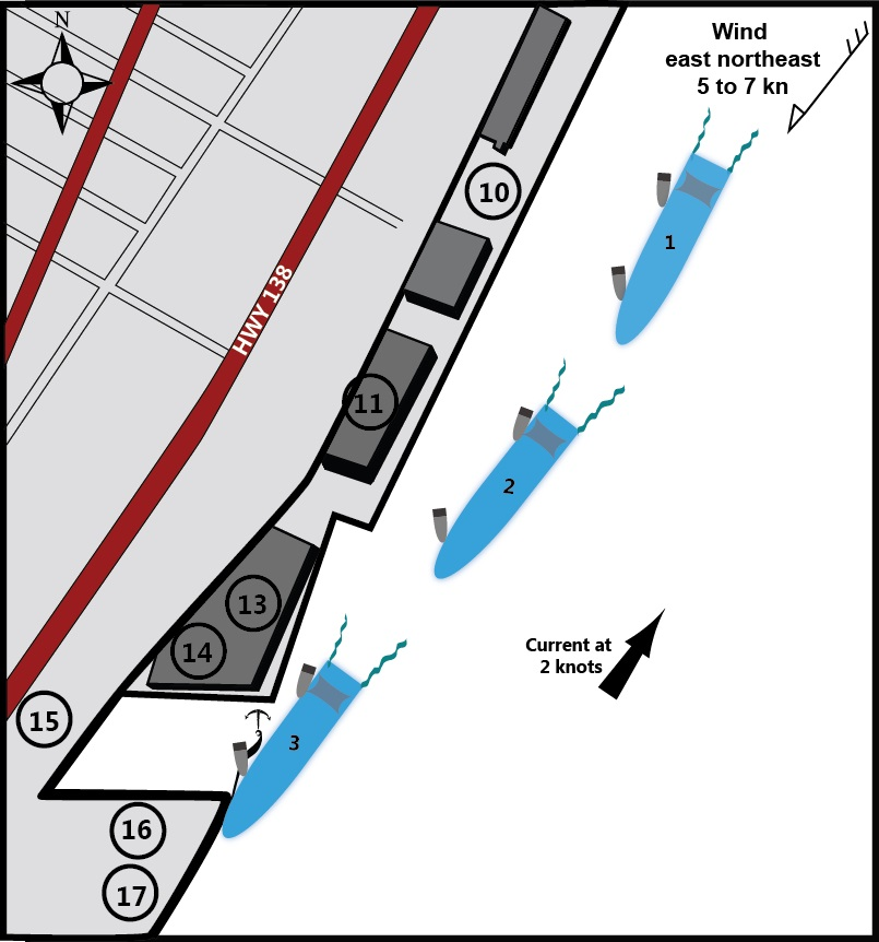In the port of Trois-Rivières, section 16 is located on the south side of a basin that also contains sections 14 and 15 (Appendix A). Section 16 is recognized as a challenging location for berthing by the Corporation des Pilotes du Saint-Laurent Central (CPSLC), the corporation contracted by the LPA to provide pilotage services in this port. The entrance to the basin is approximately 110 m wide and is perpendicular to the flow of the current in the river. The dock at section 16 runs on an axis of 273°T/093°T; Footnote 3 in contrast, the dock at section 17 runs on an axis of 210°T/030°T (Appendix A). The dock at section 16 is 175 m in length, Footnote 4 and it extends 1.9 m above the highest high water mark.