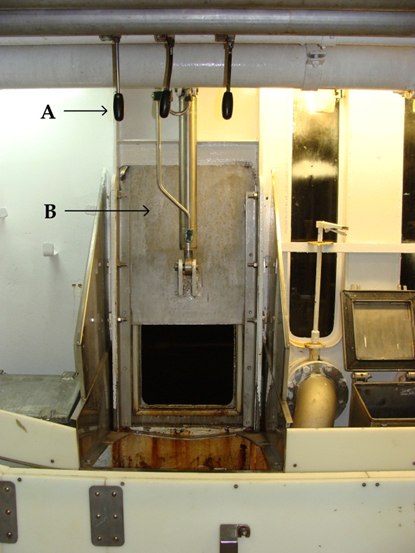 The vessel is engaged in the shrimp fishery off the East Coast of Canada and is equipped for on-board processing and freezer storage of shrimp catches. At the after end of the factory deck, the vessel has 2 holding tanks that hold the shrimp prior to processing. These tanks are filled by dumping the shrimp through hatches on the main deck. For processing, the shrimp are transferred to the factory conveyor belt by way of 2 openings in the aft bulkhead. The size of these openings, and consequently the flow of shrimp, is controlled by 2 hydraulically-operated shutter doors. When activated, these doors, which each open to a maximum of 40 cm by 40 cm, take about 2 seconds to partially or fully close, depending on the operator’s needs.