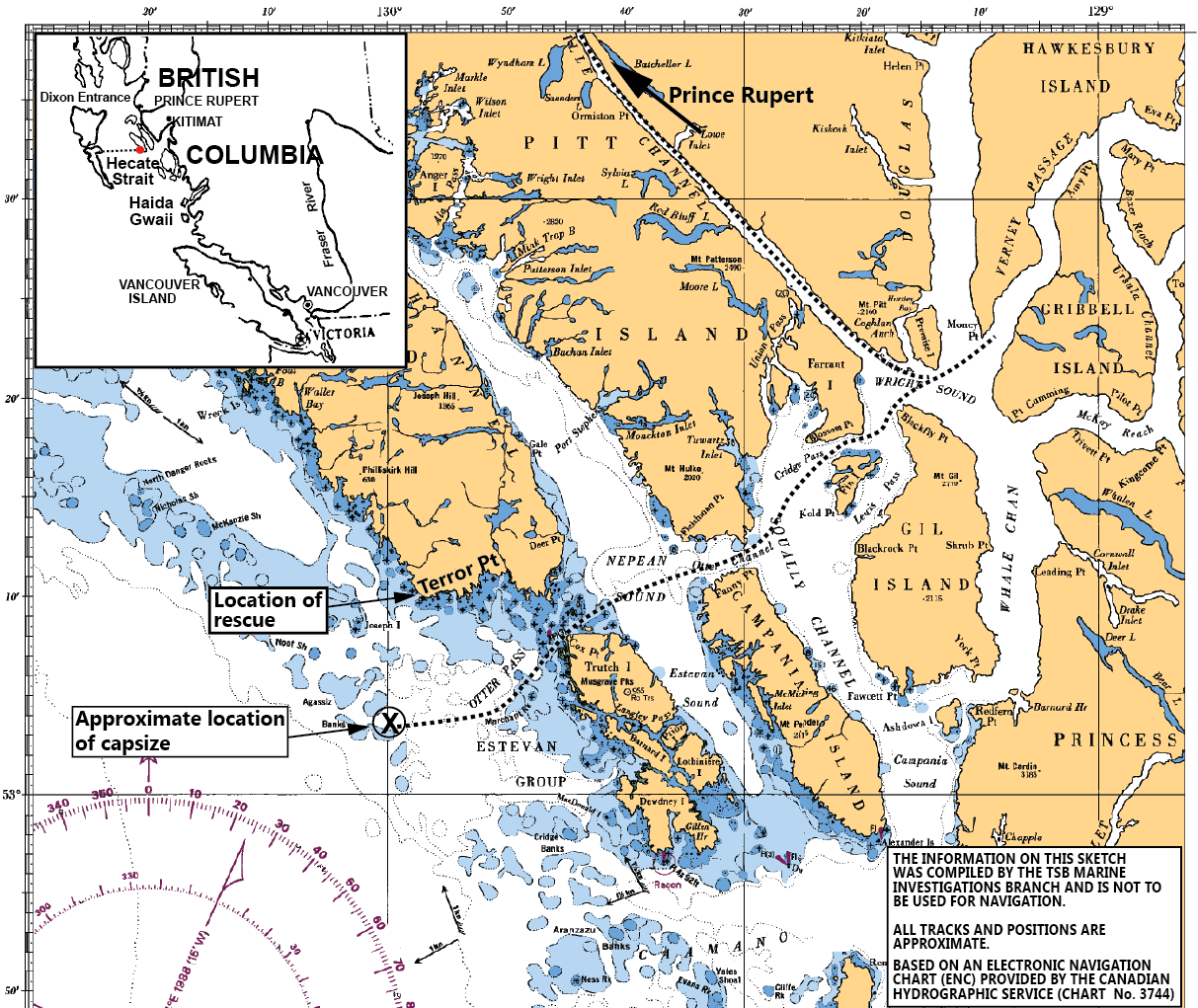 On 06 May 2012, the Pacific Siren's master/owner and 2 crew members topped up the vessel's fuel tanks in preparation to travel to Cumshewa Inlet in Haida Gwaii to begin the prawn fishery (Appendix A). They loaded 350 prawn traps, anchors, ground line and other gear on board the vessel, a combined weight of approximately 2500 kg. The prawn traps and gear were stowed on or above the main deck, and the anchors and ground line were stowed in the fish hold. They departed Prince Rupert the following morning, planning to cross Hecate Strait en route to Cumshewa Inlet. However, as the weather in Hecate Strait was poor and was not forecasted to improve until later in the week, the course was altered to fishing grounds at Verney Passage, 75 nautical miles (nm) south of Prince Rupert (Appendix A).