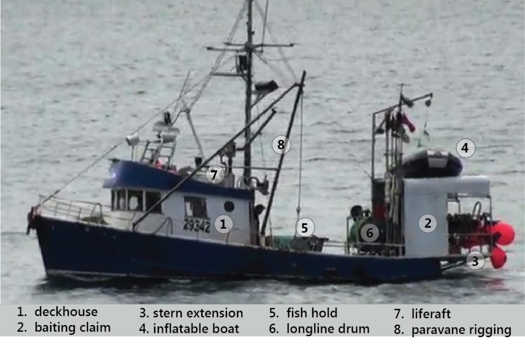 The vessel carried a 4 m recreational inflatable boat secured to the top of the baiting claim and a 4-person liferaft located on top of the deckhouse. The vessel also carried 2 lifejackets stowed in the galley, 4 immersion suits stowed in a locker on the port aft side of the deckhouse, and 1 personal flotation device (PFD) stowed near the longline drum on the main deck. The vessel was equipped with a pair of outrigger booms rigged with roll dampening paravanes.