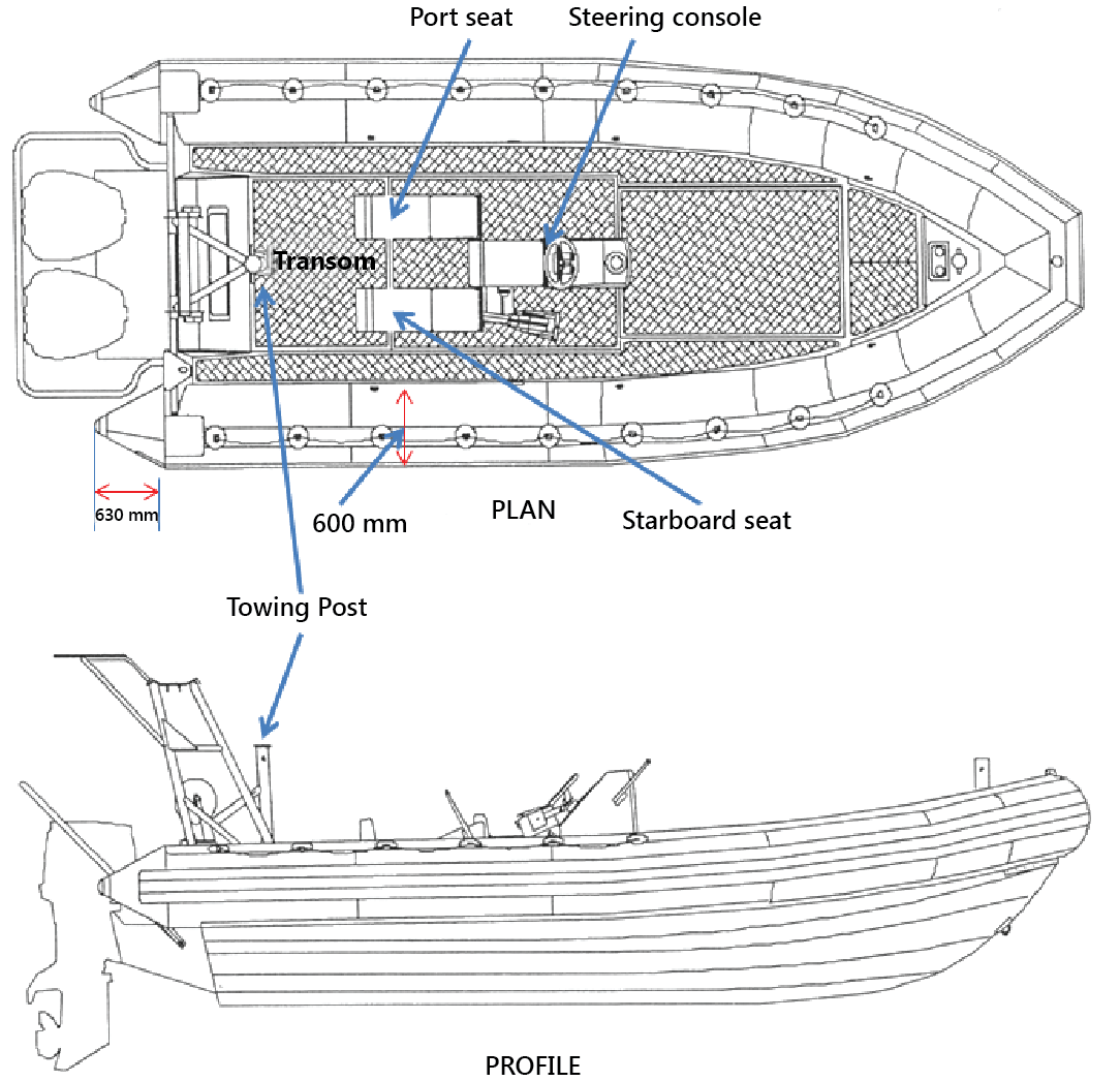 The inflatable collar is 600 mm in diameter and extends 630 mm aft of the engine bracket on both sides of the vessel. Self-draining scuppers are fitted on each side of the transom at deck level.