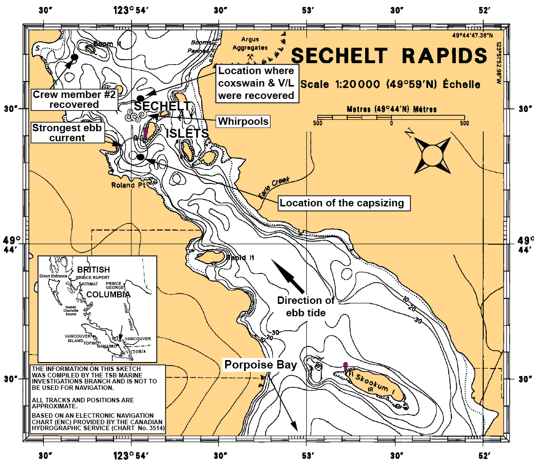 Since 2003, there have been 3 instances of the JRCC being notified of overturned or capsized vessels in and near Sechelt Rapids. Two were overturned kayaks/jet boats, and one was a tug with 4 crew on board that was towing a barge.