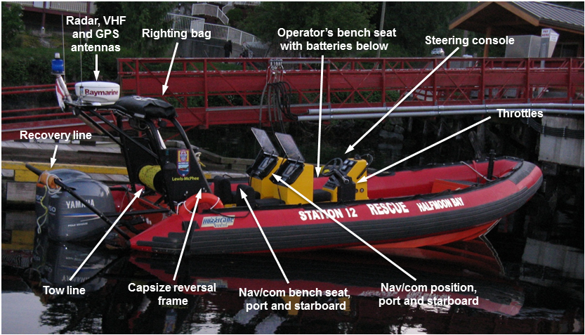 The Lewis-McPhee is a rigid-hull inflatable boat originally designed as a fast rescue craft (FRC). The vessel is operated by the Royal Canadian Marine Search and Rescue (RCM-SAR)Footnote 2 for use primarily as a search and rescue (SAR) vessel (Photo 1 and Appendix A).