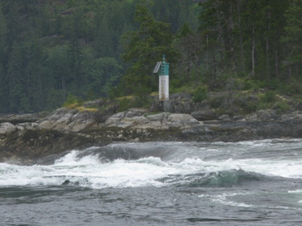 The strongest flood stream occurs to the southeast and west of Sechelt Islets. The strongest ebb stream occurs just west of the green light on Sechelt Islets (Photo 2), with a strong cross-channel set toward the west-northwest. A large back-eddy occurs to the north of the light, and whirlpools form close to the light. On 03 June 2012, the predicted time of maximum ebb current at Sechelt Rapids was 0940, at 13.6 knots. The next predicted time of slack water was 1414.