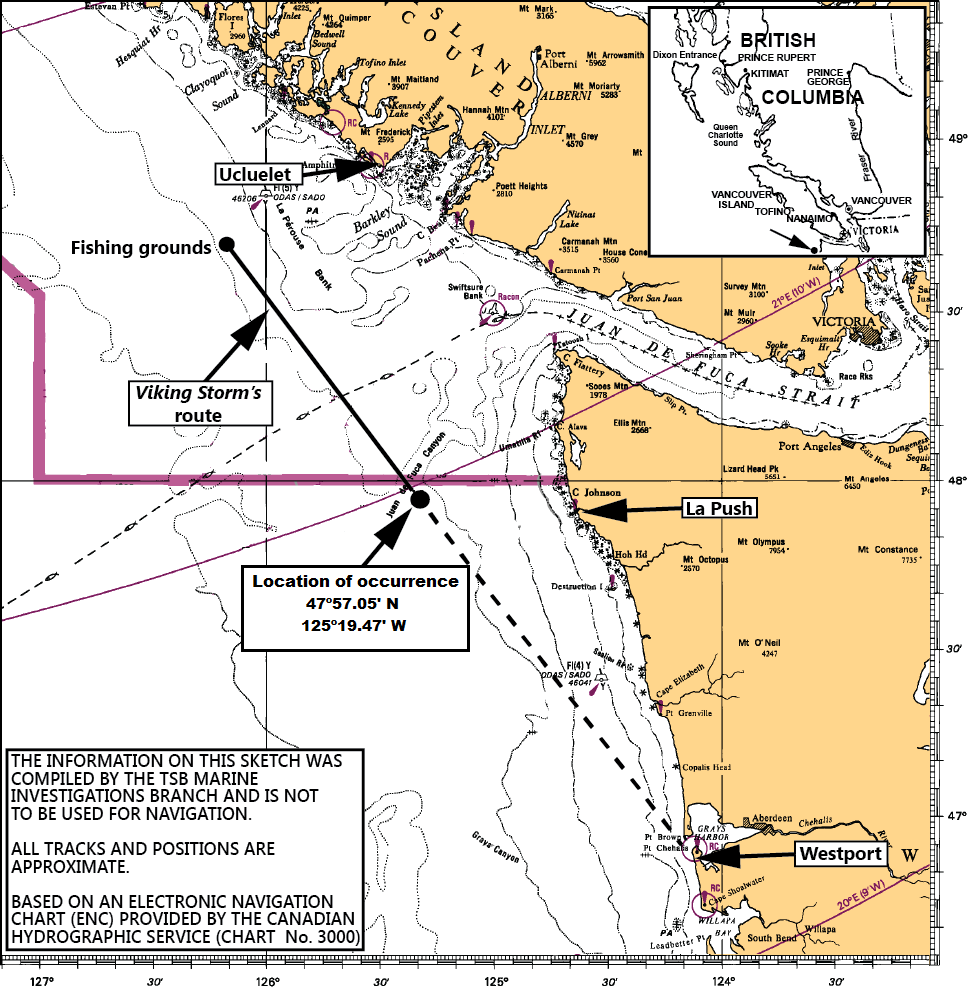On the morning of 23 September 2012, the Viking Storm returned to Ucluelet, British Columbia, following a fishing trip (Appendix A). The vessel had been carrying a complement of 4 crew members. Upon reaching Ucluelet, 2 of the crew departed, and only 1 was replaced. The deckhand informed the master of his intention not to participate in the next trip and left the vessel after helping to unload the catch. Another crew member returned from days off and joined the vessel. That same day, the master also left for an anticipated period of 3 days, and 1 of the existing crew members took over for him. At approximately 1500, the vessel departed Ucluelet for the fishing grounds with the relief master, the mate/engineer, and the crew member on board. Footnote 7