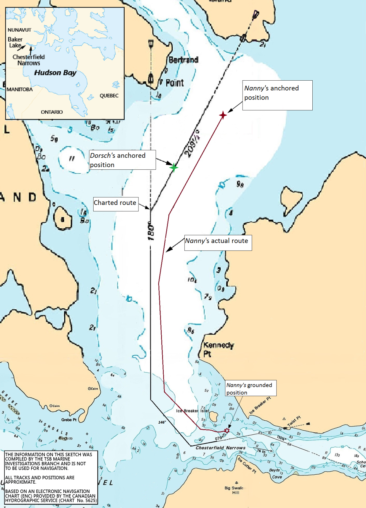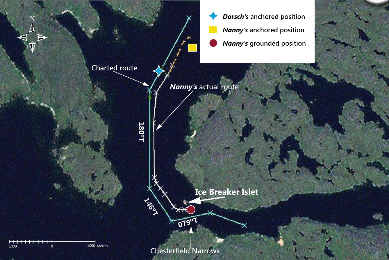 In this occurrence, the Nanny was initially required to proceed off the charted course in order to pass the Dorsch. However, this deviation was not discussed by the master and the officer of the watch (OOW), nor did they exchange other navigational information after the vessel weighed anchor. Once clear of the Dorsch, the Nanny continued on a roughly parallel course that was off the charted route by distances of up to 0.12 nautical miles (nm). This deviation from the charted route continued even as the vessel turned into Chesterfield Narrows, an area marked by range beacons, that allows for little margin of error and requires the vessel to remain as close as possible to the course line.