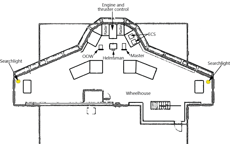 On the Nanny, the ECS monitors were not positioned in the immediate field of view of the officer at the starboard radar, nor were they in a centralized position to enable 2 bridge officers to make use of them (Figure 2). In contrast, on the Dorsch, the 2 ECS monitors were located close to the starboard radar and in line with it, putting them in the immediate view of the bridge officer at that station, and allowing for cross-checks between radar and ECS data.