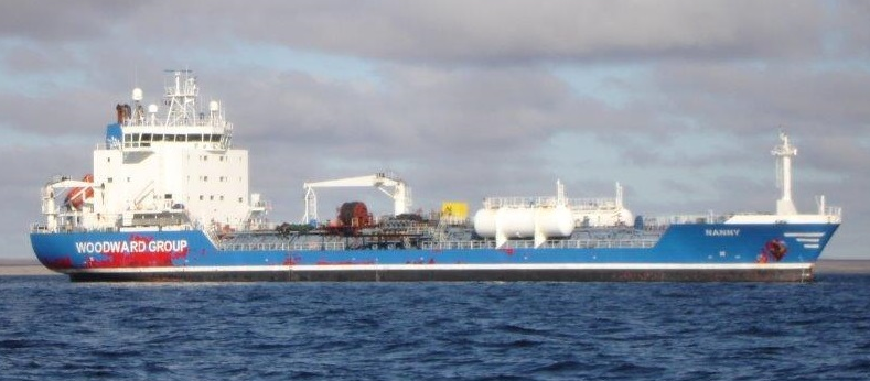 The Nanny is of typical oil tanker construction, with segregated ballast tanks and an aft superstructure on an ice-strengthened hull (Photo 1). Propulsion is provided by a diesel engine with a constant speed of 500 revolutions per minute (rpm). The vessel has a controllable-pitch propeller, a spade rudder, and 2 controllable-pitch tunnel thrusters of 450 kilowatts (kW) each, 1 at the bow and 1 at the stern. Port, centre, and starboard bridge consoles provide improved vessel handling during manoeuvres.
