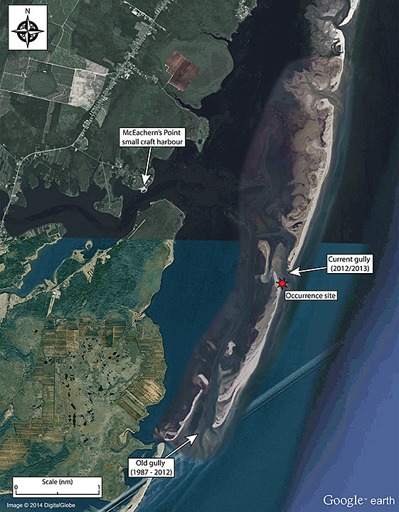 Approximately 45 fishing vessels operate out of McEachern's Point harbour. For about 30 years, the fishermen accessed the open sea by a tidal gully 5 km south of the harbour, through a channelFootnote 3 marked by Canadian Coast Guard Aids to Navigation (CCG NavAids). In the spring of 2012, CCG NavAids buoyed the route, as was customary on an annual basis. However, the fishermen were using a different route at that time, through a gully that had newly formed 3.9 km north of the original south (old) gully, closer to the harbour. Their route was privately marked by a single line of orange fishing buoys and was based on their own soundings.