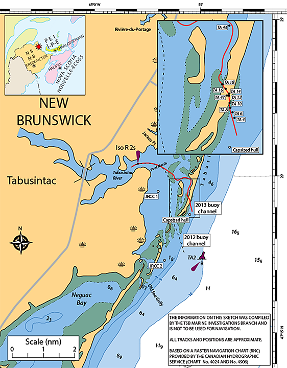 At 0612, MCTS issued a mayday that provided a second updated position, following a report to JRCC from a fisherman on site that described the vessel's position as being between buoys TA-4 and TA-12. JRCC determined this second position by the location of buoy TA-2, using a combination of CHS charts, and established the location to be in the entrance of the old buoyed channel in Tabusintac Bay.