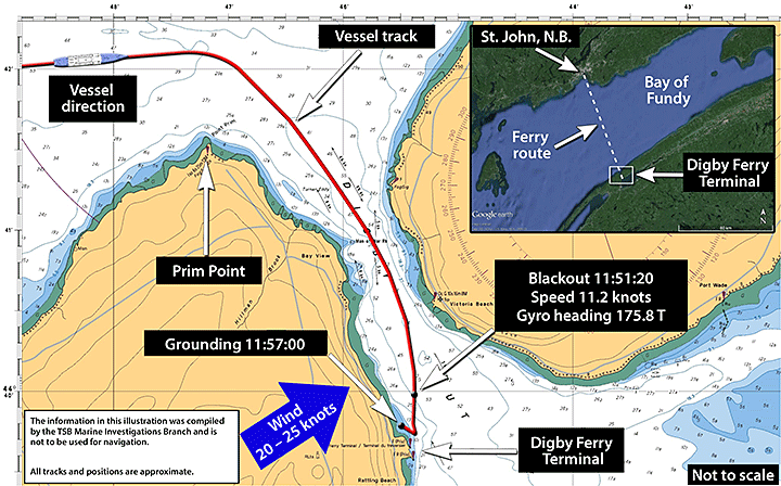 Immediately following the grounding, the OOW reviewed the on-scene commander checklist for grounding with the master. The master ordered the crew to take up the slack on the anchor chains and check the vessel for water ingress and damage. About 2 minutes later, the master contacted Marine Communications and Traffic Services Saint John (Fundy Traffic) and advised that the vessel had sustained a power failure and, upon further discussion, that the vessel had run aground approximately 500 yards from the dock (Figure 1). The master reported that they were in no immediate danger, but required tug assistance to get to the dock. At about 1202, Fundy Traffic requested information for passengers and crew on board and asked whether the vessel had any water ingress. The OOW replied that the vessel was presently being checked for water ingress on board and reported the number of passengers and crew indicated on the manifest.