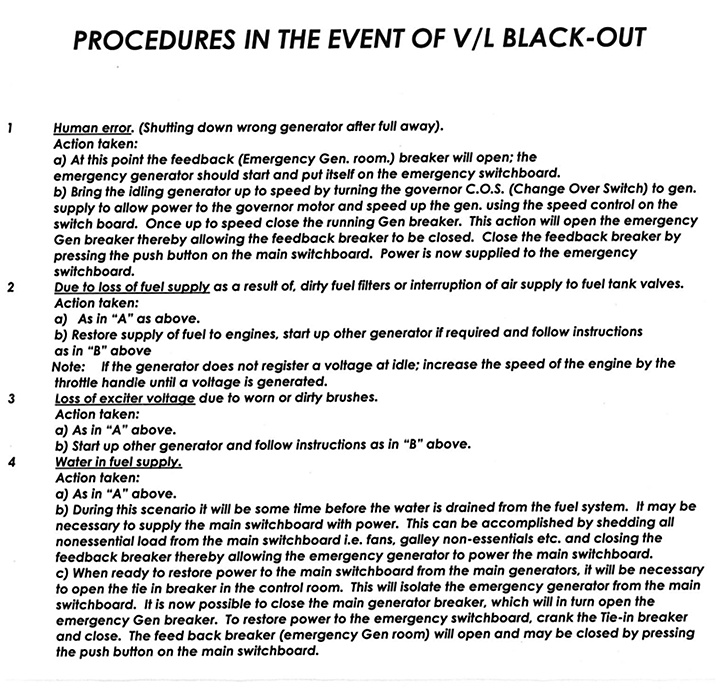 - Neither the on-scene commander checklist for a blackout/engine failure nor the engine room blackout procedures included information to ensure control of the vessel's propulsion when operating on emergency power.