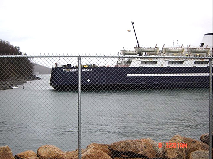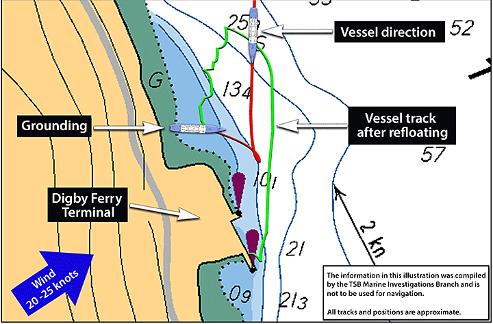 At 1156:25, the Princess of Acadia reached an astern speed of 3.7 knots, and an impact was felt on the vessel as it began grounding near the shoreline, at which point the master ordered the engine room to declutch the shafts. Just before the port shaft declutched, the port propeller made contact with the bottom. At approximately 1157, the vessel was aground about 0.1 nm NNW of the Digby terminal in position 44°39.8′ N, 065°45.5′ W (Photo 2).