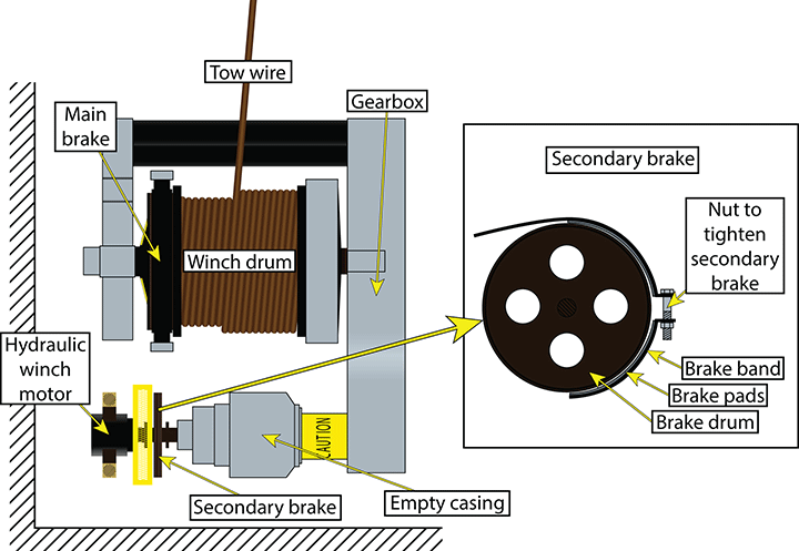 On the Western Tugger, the main brake was unable to keep the winch drum from slipping while towing, even with the on-board practice of keeping the drum clutched in to the motor. For this reason, a secondary brake, which consisted of a brake drum on the drive shaft, had been installed.Footnote 5 However, these 2 brakes combined were still unable to keep the winch drum from slipping, so the on-board practice was to manually tighten the nut-and-bolt assembly on the brake band of the secondary brake in order to stop the winch drum from slipping.