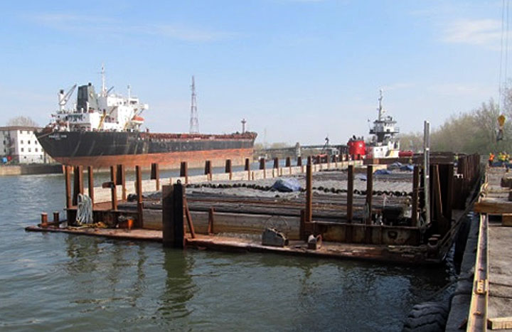 Loading commenced on 29 April and involved fitting the bundled rebar of various lengths on the barge deck such that it was tightly and evenly packed. To keep the barge stabilized during loading, water was pumped in and out of tanks on the starboard side as required (Photo 4). The barge was loaded to a total weight of 7135 tonnes, a point at which the master and owner considered there to be adequate remaining freeboard and acceptable trim. Because the rebar was tightly packed to prevent movement, no lashings were used to secure it in place. When loading was complete, tarps were fastened over the cargo to protect it from the elements.