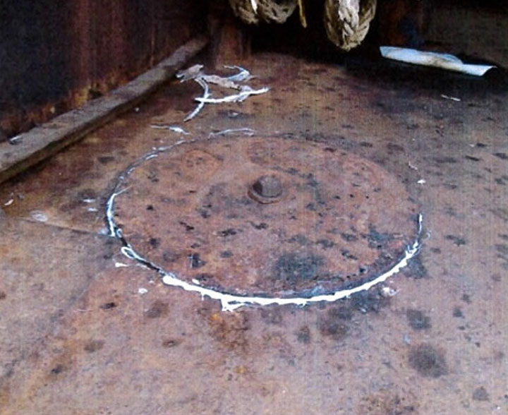 Prior to loading the cargo for this voyage, the barge owner visually inspected the seals on the hatches. A bead of silicon was applied around selected hatch covers where the previously applied sealant had deteriorated (Photo 3).