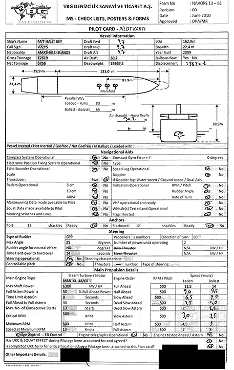 On the Halit Bey, the pilot card contained some information that was incorrect: the type of rudder was described as “CPP,”Footnote 19 the vessel's minimum speed was stated to be 13 knots, the direction of propeller rotation was recorded as being opposite to that depicted on the sketch, and the main engine critical speed was stated to be 500 revolutions per minute, which was the same as the nominal speed. In addition, the line to indicate if the vessel had a bulbous bow had not been filled out (Appendix C).