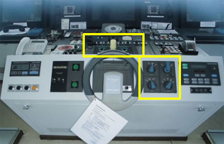 | Bridge main console NFU tiller switch (at far right end of console) | – | – | – | √ if right-hand panel is set to centre + hand + NFU | – |