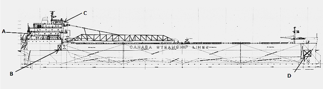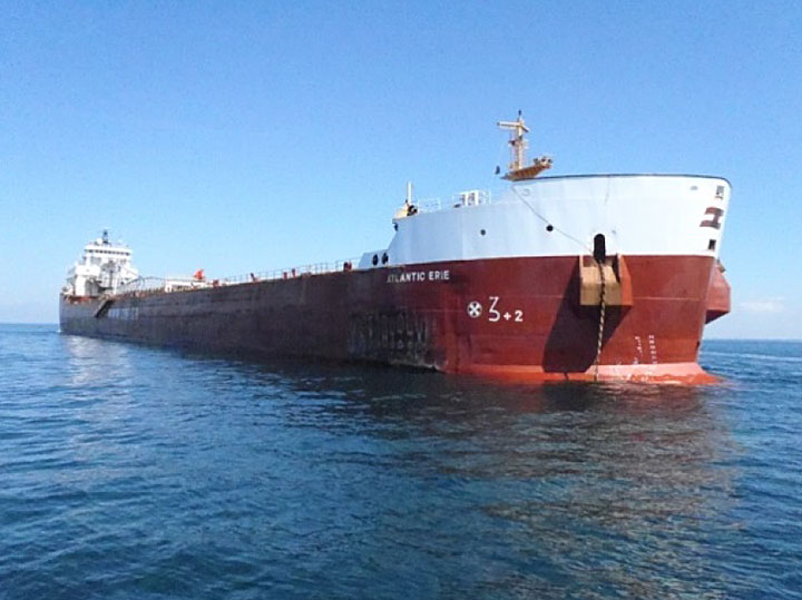 The Atlantic Erie is a dry bulk cargo vessel of steel construction with machinery space and accommodations located aft. The vessel has 5 cargo holds and is fitted with a self-discharging system that allows cargo to be released from the bottom of the cargo holds onto conveyor belts, transported above deck level via an elevator system, and then transferred onto a discharge boom conveyor and offloaded.