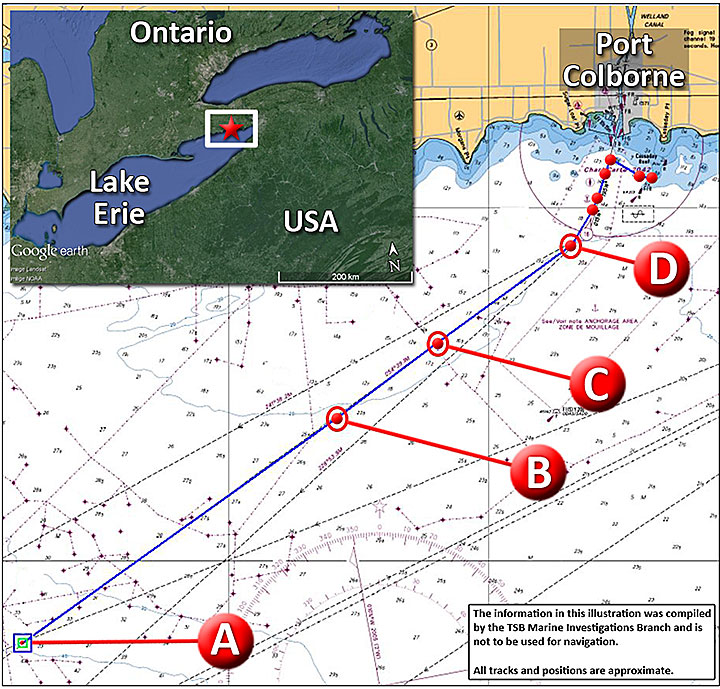 Upon arriving in his cabin, the master looked at the ECPINS slave monitor and noticed that the vessel's CMG was easterly, but that the vessel-shaped marker which indicates the heading was pointing southerly (Appendix E). The master quickly returned to the bridge and requested the magnetic heading from the helmsman, who reported it to be 111° magnetic (M).Footnote 15 The master looked outside and saw that the shoreline was on the vessel's port side, instead of on its stern. He immediately ordered the helm hard to starboard in order to correct the vessel's course and increased the propeller pitch to get more power ahead. The vessel began turning to starboard but, moments later, the hull touched bottom and, at 1020, the vessel ran aground 1.5 nm southeast of the Port Colborne outer piers.