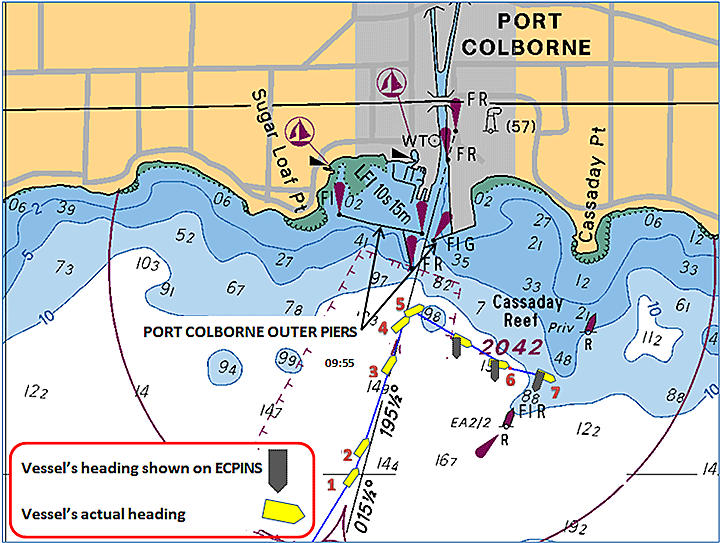 The following image has been compiled by the TSB to show the difference between the vessel's course made good (CMG) and the gyrocompass heading as it was being displayed on the Electronic Chart Precise Integrated Navigation System (ECPINS) at the time of the occurrence. The grey (dark) vessel-shaped markers show what the master would have been seeing on the ECPINS, whereas the yellow (light) markers show the actual CMG.
