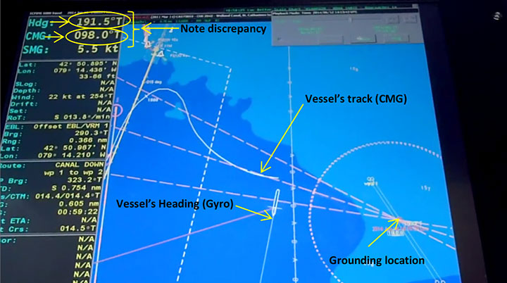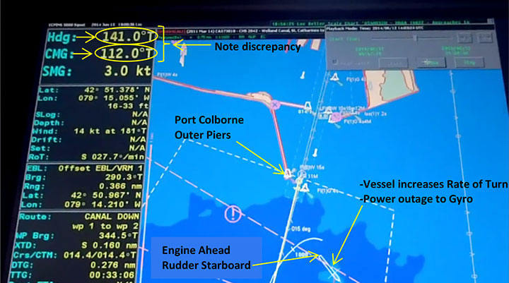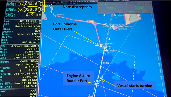 The screenshots in Appendix F are from a recording of what the ECPINS was displaying at the time of the occurrence. They show that, as the vessel began turning to starboard and away from the entrance to the canal, the difference between the vessel's heading and the CMG started to increase, as per usual (Appendix F, Screenshot 1). As the vessel was turning, the difference between the vessel's heading and the CMG continued to increase, which is also normal (Appendix F, Screenshot 2). However, after the vessel completed the turn and had been proceeding on 180°G for approximately half a minute, the difference between the CMG and the heading continued to increase when it would normally begin to decrease. In addition, the vessel-shaped marker was pointing southerly, even though the vessel was proceeding easterly (Appendix F, Screenshot 3).