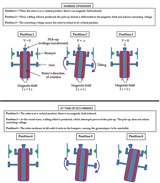 When a vessel turns, torque is applied to the rotor's vertical axis, which causes the rotor to tilt in relation to its housing. Under normal operating conditions, a voltage transformer (called pick-up) located above the rotor senses this tilt by identifying differences in the magnetic fields on either side of the rotor. The pick-up then sends an electric current to neutralize the difference in the magnetic fields, thereby minimizing the tilt of the rotor. However, if power to the pick-up is interrupted, even briefly, when the vessel is turning, the pick-up cannot send the electric current necessary to counteract the tilt, and the rotor may lose its orientation altogether and come to rest against the bumpers (Appendix G). From the time power is restored, it may take between 90 and 120 minutes for the gyrocompass to realign with true north. A power interruption that occurs while the vessel is proceeding on a steady course will not have the same effect, given that the existing momentum of the rotor will keep it aligned for several minutes after power is lost, provided the rotor is not subjected to a tilt.