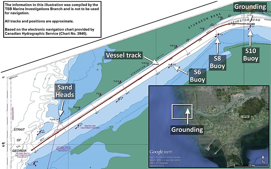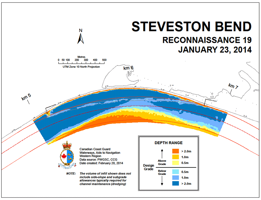 At the time of the occurrence, the Steveston Bend had silting on the south side that extended into the navigable channel, thereby reducing the design depths of 10 m between kms 5 and 6 and 10.1 m between kms 6 and 7 (Appendix B). Buoy S10, which is approximately where the vessel grounded, is located on the south side of the channel and is slightly east of km 6.