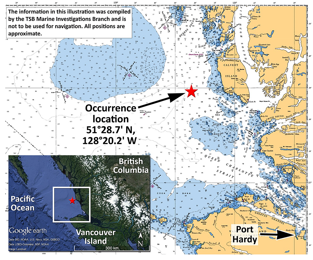About halfway through setting the traps, the crew members processing the catch heard a call for help. At that time, the newest crew member was overboard, in the water, and about 10 m off the stern of the vessel, in position 51°28.7′ N, 128°20.2′ W (Appendix A). One crew member immediately notified the master while the other crew member deployed the lifebuoy. However, the throwing line of the lifebuoy became entangled in the railing and did not reach the overboard crew member. The master reduced speed, went to the helm station on the working deck and began to turn the vessel around. The master and other crew lost sight of the overboard crew member from their position on deck. The master returned to the wheelhouse to relocate him. Once he was spotted again, the master returned to the helm station on deck. The overboard crew member remained visible at the surface of the water until the vessel began to approach him, at which time he disappeared under the surface of the water.