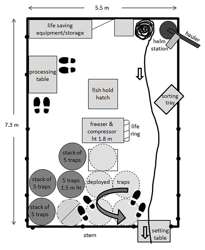 The working deck is surrounded by solid bulwarks of 0.9 m in height; an aluminum railing of 1.1 m in height is attached to the top of the bulwarks, except for the hauling and setting stations, where the middle bar is removed. The working deck contains a helm station, the trap hauler, a lifesaving equipment storage cupboard, a prawn processing table, a blast freezer and a compressor, access hatches, and a setting table (Figure 1). The forward half of the working deck is covered with a tarp that protects the prawn sorting area from the weather but obstructs the visibility of the setting table from the wheelhouse.