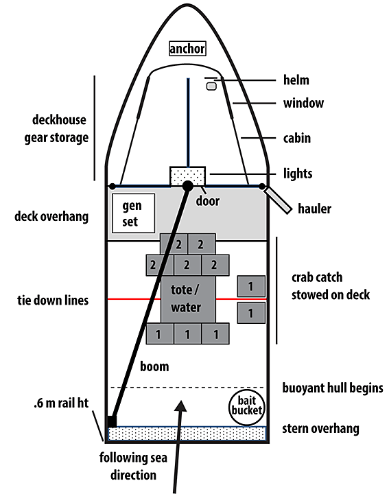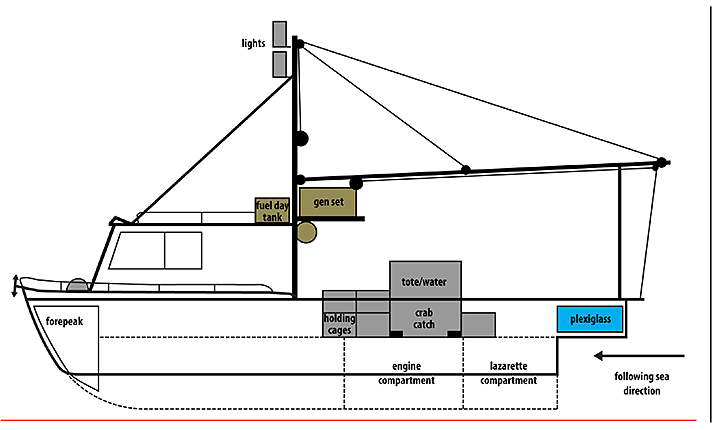 | Cargo | Approximately 1250 kg of crabs and 600 kg of water and gear |
