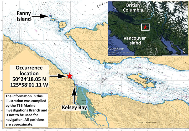 After the vessel capsized, the crew member and master swam back to the overturned vessel and hung on to the hull. Shortly afterwards, the crew member and the master abandoned the vessel and swam for shore. After swimming approximately half the distance to shore, the crew member could no longer see the master or the vessel. The Five Star is presumed to have sunk at approximately 2100 on 12 June in position 50°24'18.05" N, 125°58'01.11" W, two nautical miles (nm) east of Race Passage, British Columbia (Appendix C).