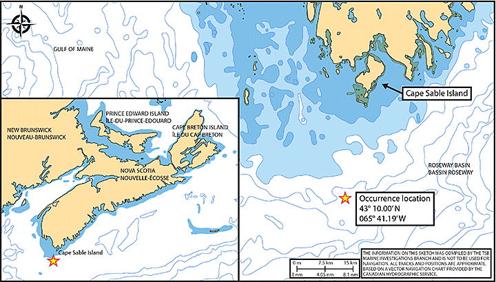 At approximately 2105, while the master and crew were attempting to recover the trap and anchor, another wave struck the vessel on the port side. Although some of the traps had been secured to the aluminum guardrail, this wave knocked about 6 of the stacked traps onto the deck. Upon impact, one of the crew members was thrown to the centre of the deck and the master was thrown overboard via the open stern. Moments later, the anchors and remaining traps went overboard, pulling the port aluminum guardrail off the gunwale and overboard by way of the open stern as well. At this time, the vessel was approximately 15 nautical miles south of Cape Sable Island, Nova Scotia (Appendix B).