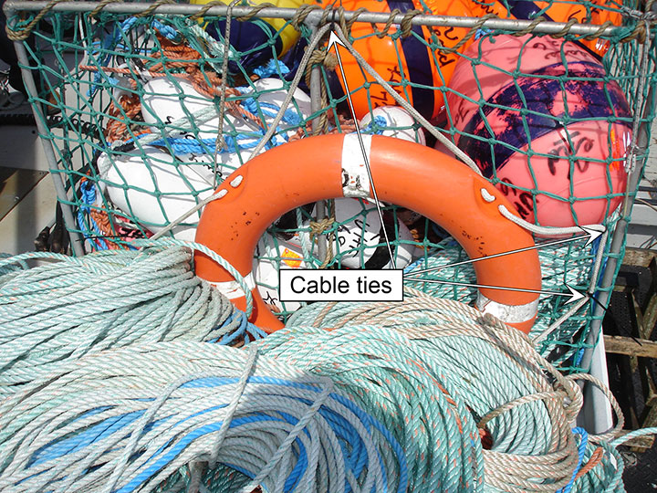 The immersion suits and lifejackets were stowed in the vessel's forepeak. The life rings were located on top of the wheelhouse and their grab lines had been secured to a mesh container using cable ties (Photo 3).