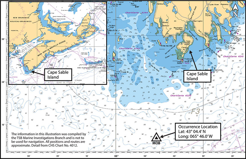 A JRCC Hercules fixed-wing aircraft departed the nearby Yarmouth airport at 0905, and within minutes the crew heard a distress call from the Cock-a-Wit Lady on VHF radio channel 16 involving a person overboard in their area. The crew from the Hercules self-tasked and headed toward the distressed vessel on a bearing provided by the radio direction finder, which gives the general location of the vessel. The second aircraft, a CH-149 Cormorant helicopter that was also dedicated to search and rescue, was unable to respond immediately to the Cock-a-Wit Lady , as the helicopter was responding to a simultaneous distress case on another vessel.