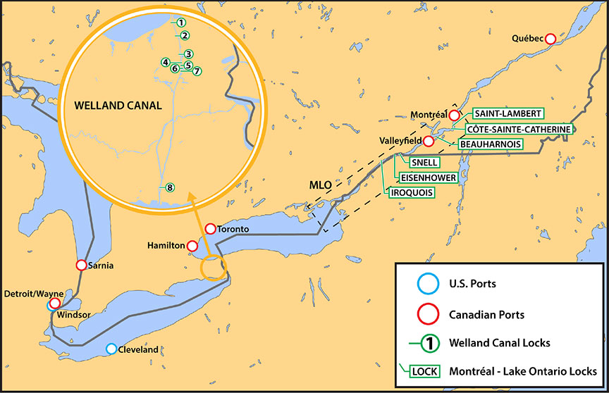 The St. Lawrence River extends over 1197 km, with the western approach connected to Lake Ontario and the eastern approach connected to the Atlantic Ocean by an estuary and the Gulf of St. Lawrence. The St. Lawrence Seaway (hereafter referred to as “the Seaway”) is a system of locks, canals, and channels within the St. Lawrence River that allows vessels to sail from Montréal, Quebec, into the Great Lakes (Appendix A). The Seaway consists of 2 sectors: the Montréal to Lake Ontario (MLO) sector (306 km) and the Welland Canal (44 km) that joins Lake Ontario with Lake Erie.