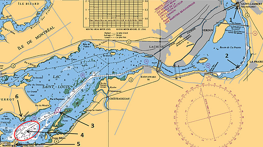 At 2212 the tug LaPrairie ,Footnote 14 which was en route to the Beauharnois locks to perform ice maintenance, advised Seaway Beauharnois that it would have to turn around and return to the Côte-Sainte-Catherine lock. The tug was 3.2 nm from calling-in point 3 (Pointe Moulin, Lac Saint-Louis, approximately 3 nm below Pointe Fortier anchorage) and had encountered an ice floe in the channel that it could not break or get through. Seaway Beauharnois acknowledged the message and advised the supervisor. Shortly afterward, Seaway Beauharnois requested that the tug return to the Canal de la Rive Sud and perform icebreaking work in the areas of the canal that the icebreaker could not reach.