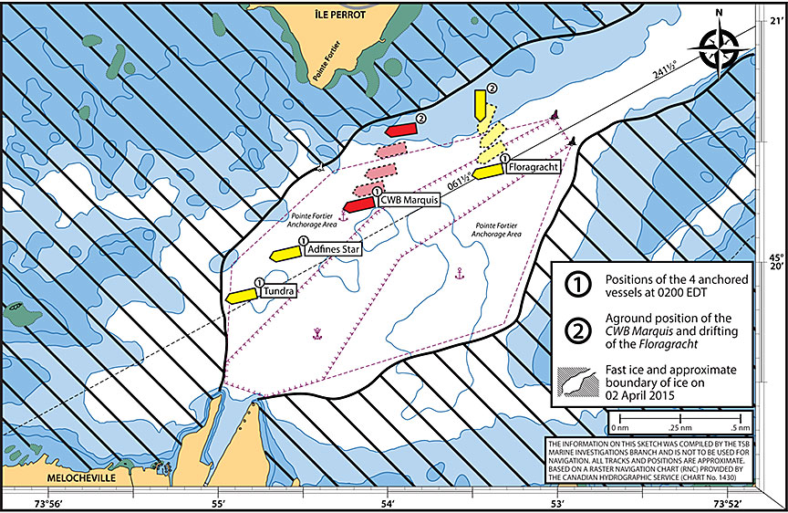 The anchorage at Pointe Fortier was therefore deemed the best option to maximize transit time; furthermore, the most recent icebreaking work in the anchorage area had been completed the day before.