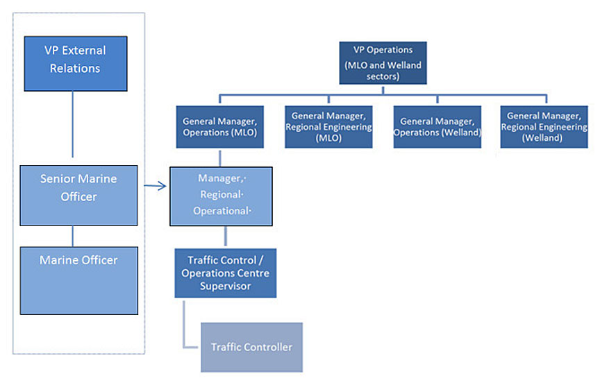 The SLSMC has a Vice-President, Operations, who is responsible for Engineering, Operations and Maintenance, and Safety for the MLO and Welland sectors of the Seaway. Each sector has a General Manager of Regional Engineering and a General Manager of Operations, both of whom report to the Vice-President, Operations (Appendix D). The General Manager, Operations, for the MLO sector was responsible for developing the vessel traffic management plan for the opening day of the Seaway.