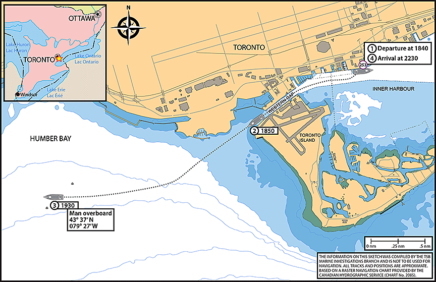 The master stopped the engines for a short time, altered course to starboard, and then, when clear,Footnote 3 manoeuvred the vessel in order to return on a reverse track. At 1933, the master called the Toronto Police Service (TPS) marine base on the VHF radiotelephone and reported a person overboard. The master then activated the PA system override and instructed the DJ to stop the music. The man overboard signal was not sounded so as not to alarm the passengers. At 1938, the last known position of the person overboard was relayed to the authorities.
