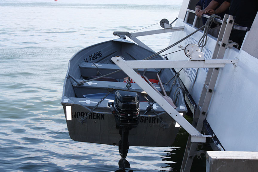 The Northern Spirit I is fitted with an emergency boat that is stowed in launching davits at the stern of the vessel on the main deck (Photo 2).
