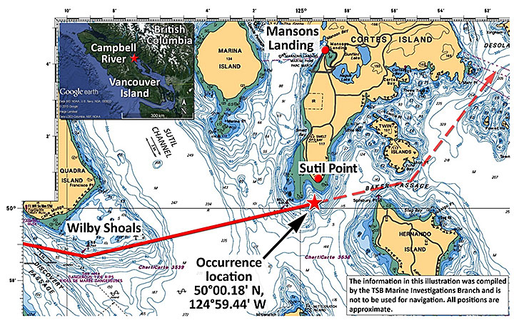 The weather conditions were favourable until the vessel passed Wilby Shoals, British Columbia, where the master altered course to 55° magnetic and began to transit Sutil Channel, British Columbia. At this point a squall approached and sea conditions deteriorated, with observed 3-m waves and northwest winds of 40 to 50 knots.