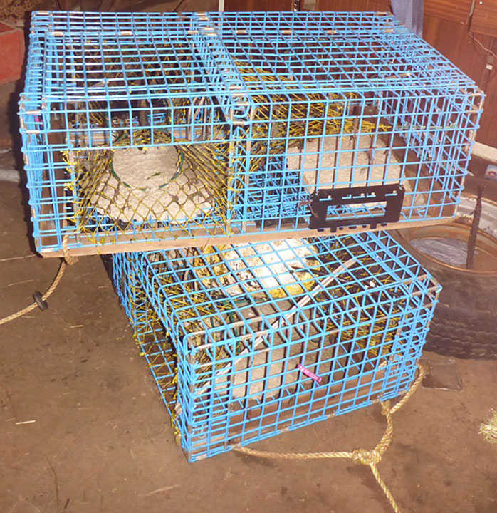 By then the second trap had been hauled up to the gunwale, so the deckhand pulled it onto the rail and began removing dirt, old bait, and lobsters from the trap. Meanwhile, the master continued to repair the broken snood.