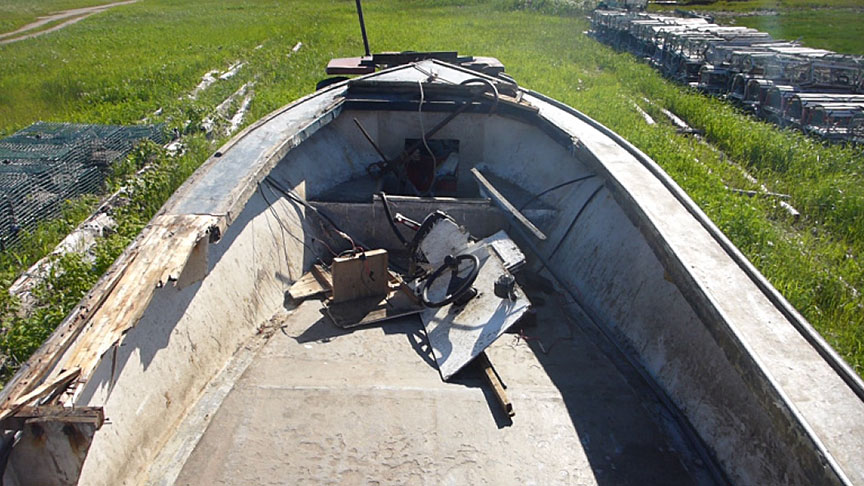 The vessel's small open wheelhouse, aft port gunwale, lobster trap hauler, and boom were torn off when the overturned vessel was being towed in to Miller Brook Wharf (Figure 3). The outboard motor, hydraulic hauler engine, and electronic equipment were contaminated by saltwater.