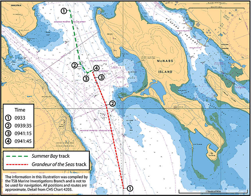 While the Summer Bay was outbound, the cruise ship Grandeur of the Seas was inbound at the mouth of the harbour, destined for Pier 20 at the Halifax cruise ship terminal. There were about 2000 passengers and 770 crew members on board the Grandeur of the Seas. The bridge team consisted of the master, the staff captain, the chief officer, and a pilot.